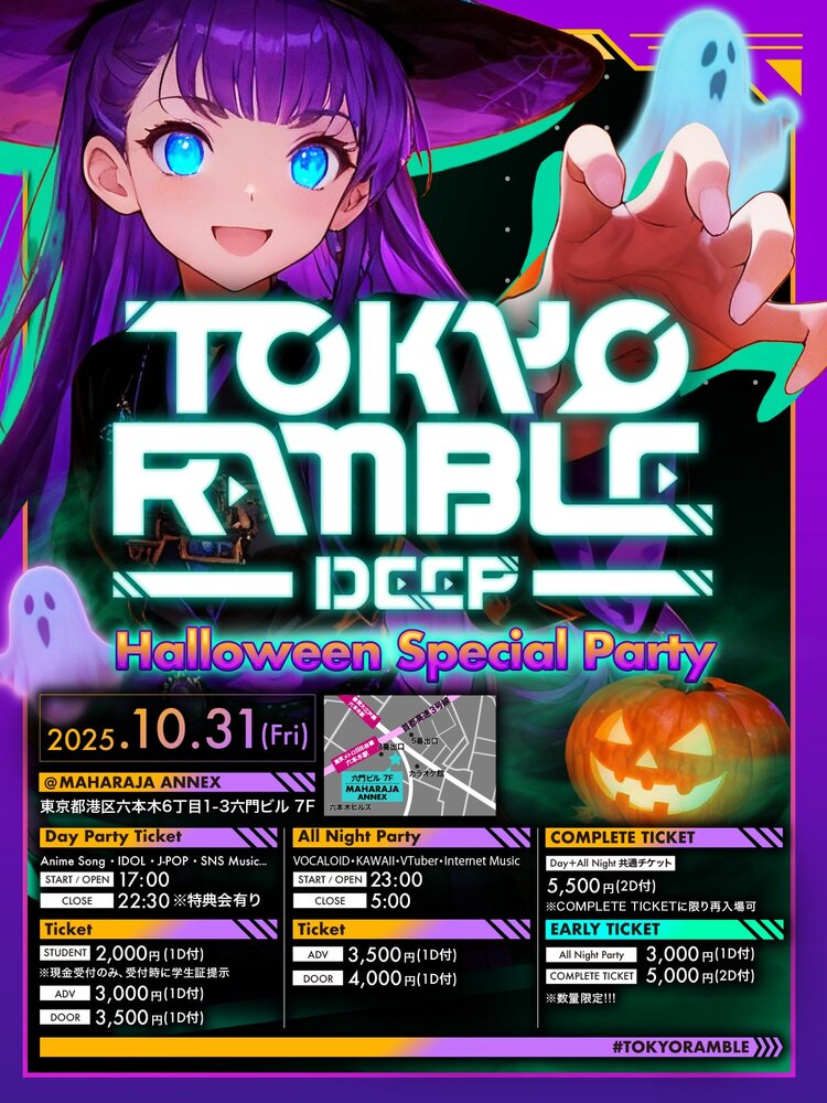 TOKYO RAMBLE DEEP - Halloween Special Party - SCHEDULE 2025/10/31(金) 17:00 - MAHARAJA ANNEX 地図を表示 TOKYO RAMBLE DEEP - Halloween Special Party - 【Day Party】にDJとして出演いたします。 ※【All Night Party】には出演しませんのでご注意ください 詳細はチケットページからご覧ください。 チケットページ URLをコピーする 報告する