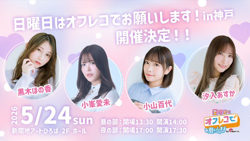 日曜日はオフレコでお願いします!in神戸 SCHEDULE 2026/05/24(日) 新開地アートひろば 2F ホール 地図を表示 【昼の部】OPEN 13:30/START 14:00 【夜の部】OPEN 17:00/START 17:30 『日曜日はアフレコでお願いします!in神戸』 に出演いたします。 詳細はiWAT TVオフィシャルXをご確認ください。 iWAT TV Xアカウント URLをコピーする 報告する